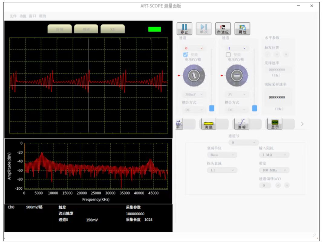 Art-Scope虛擬儀器的演示程序,驅(qū)動PXI8910高速采集卡,在測試面板上實現(xiàn)時域、頻域、XY軸信號的顯示,可設(shè)置軟件觸發(fā)、外觸發(fā)、同步信號觸發(fā)、通道觸發(fā)等工作方式,測試面板還提供了波形的平移、游標(biāo)、測量、特征值顯示等工具控件。